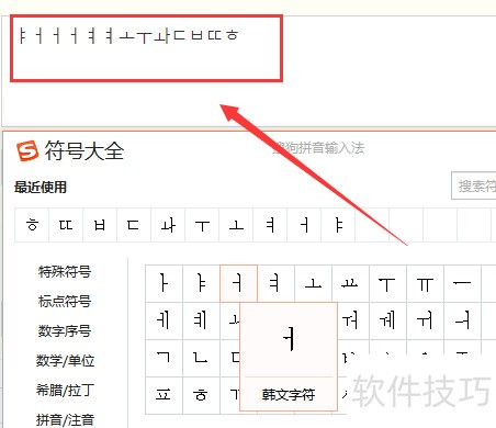 12、 选择所需韩文字符,点击后即可在文本框中输入。