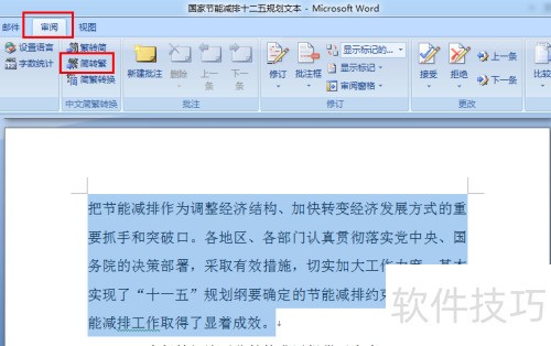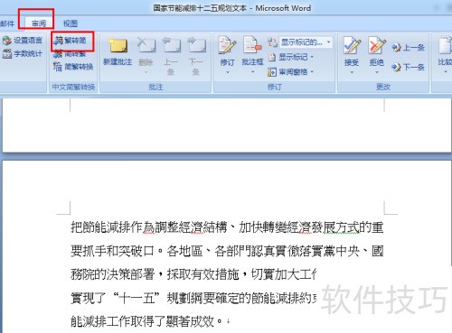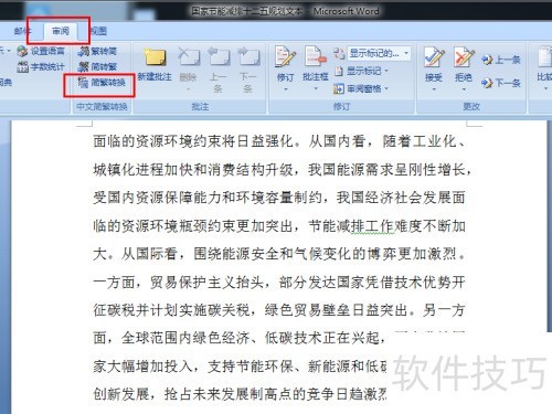 2、 点击审阅标签,选择简体转繁体功能,即可完成转换。
