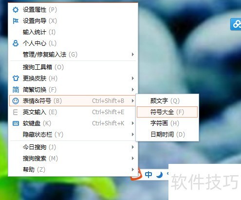 6、 右键点击输入法悬浮窗中键盘以外的区域,可在弹出菜单中选择表情符号或进入符号大全。