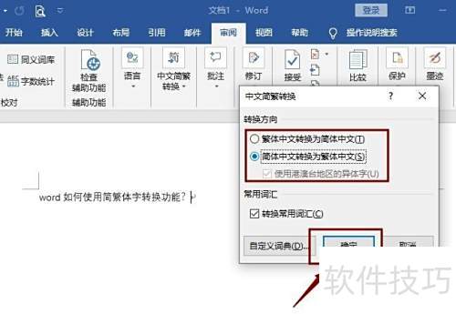11、 根据当前文字类型选择对应转换选项:简体转繁体或繁体转简体,确认选择后点击确定完成操作。