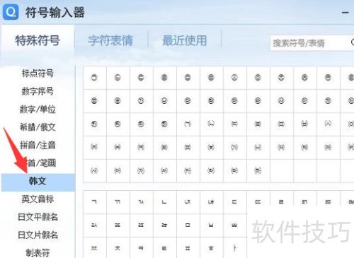 4、 进入特殊符号选择界面,包含标点、数字序号、日文平假名等内容,所需韩文位于界面中央区域。