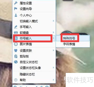 6、 在QQ输入法悬浮框任意位置右键点击,弹出菜单后选择符号输入,进入特殊字符选项即可查找所需符号。