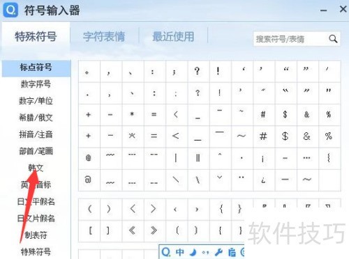3、 此处需使用符号输入功能,点击后会出现特殊符号与字符表情两个选项。由于韩文归类为特殊符号,因此应选择特殊符号选项进行操作。