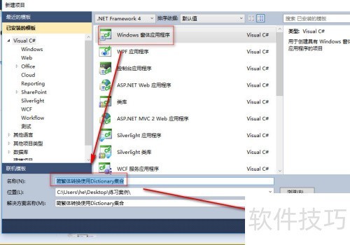 2、 选择Windows窗体应用,将其命名为简繁体转换使用Dictionary集合,然后点击确定完成创建。