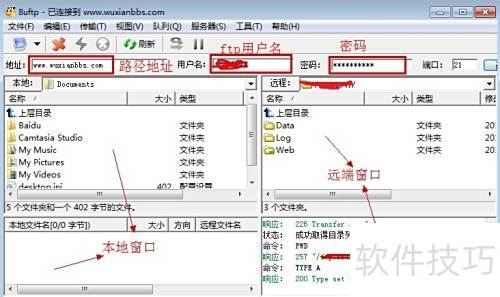 3、 解压后需配置服务器提供的FTP账号、密码及访问路径(如IP或域名),具体设置方法见示意图。