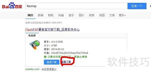 1、 在百度搜索flashfxp,首个结果即为该上传工具。点击告诉下载旁边的普通下载即可获取。不选择高速下载的原因是它需额外安装软件,操作繁琐,而普通下载更直接便捷,省时省力,适合快速获取所需文件。