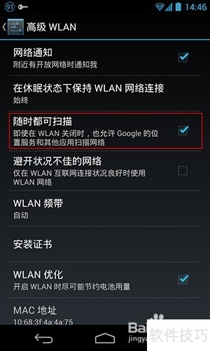 13、 在Wi-Fi设置中,进入设置→WLAN→高级,找到随时都可扫描选项并启用即可完成配置。