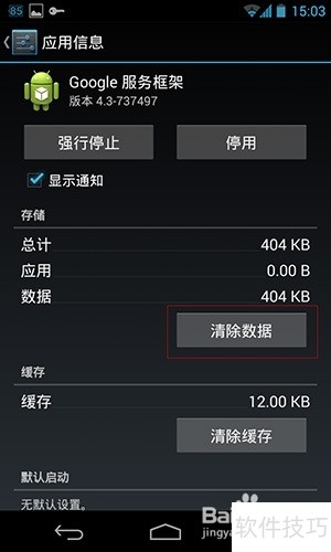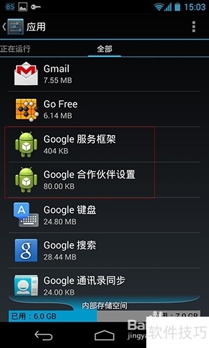 3、 进入手机设置中的应用管理,找到Google服务框架和Google合作伙伴设置,依次进入后分别选择清除数据选项,完成数据清理操作。