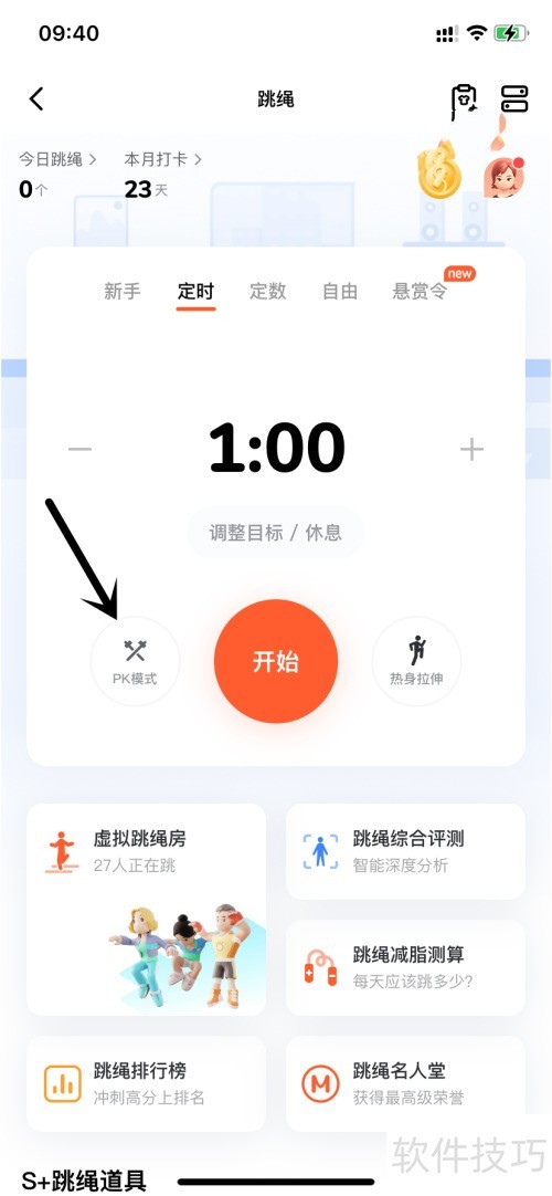 6、 进入跳绳页面后,点击PK模式开始挑战。