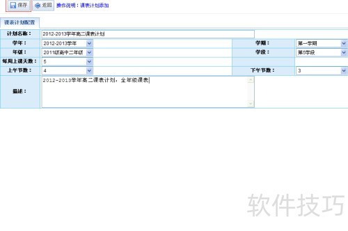 11、 在添加课表计划页面,输入名称并选择学年、学期和年级后,点击保存按钮即可成功创建课表计划。界面效果所示。