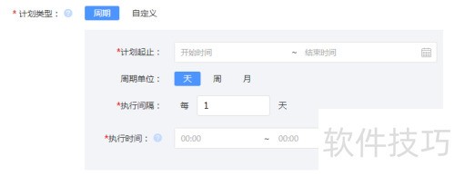 11、 周期是指具有规律性的任务安排,包括计划的起止日期,即巡检单生效的时间范围;周期单位分为天、周、月;执行间隔依据单位设定,如每N天、每N周的指定星期几,或每N月的第几周星期几;执行时间指每次任务的具体开始与结束时刻,可设置多个时段,每个时段生成一个巡检单,至少设置一个执行时段。
