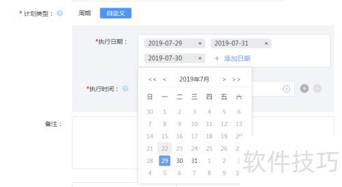 12、 自定义指不固定周期的任务,包括执行日期(支持单选或多选,表示任务执行的具体日期)和执行时间(每段时间对应一个巡检单的起止时间,可设置多个时段,至少设置一个)。