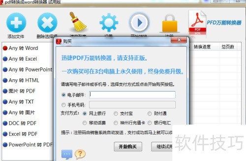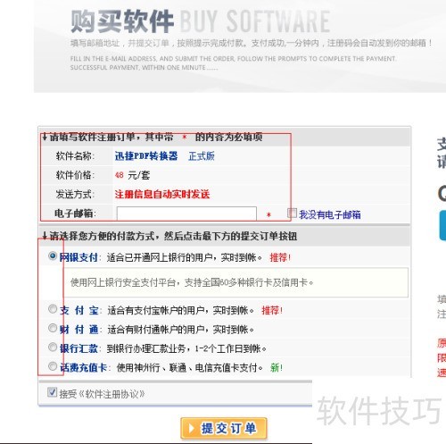 2、 点击后弹出支付方式选项,可选邮箱或手机接收注册码,支持多种付款方式,确认选择后点击购买即可完成。