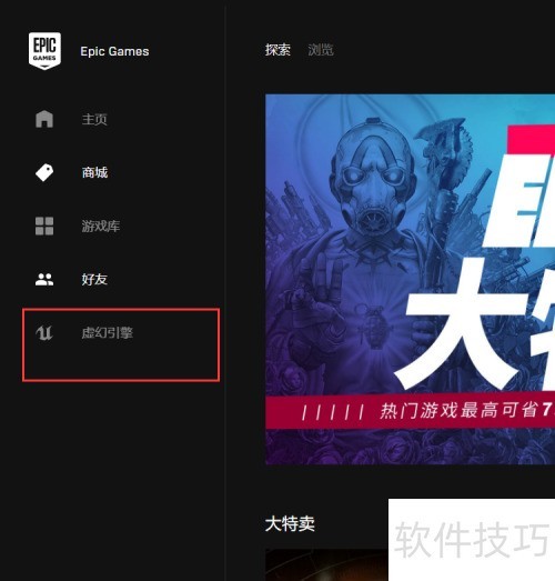 3、 打开游戏软件后,点击左侧的虚幻引擎选项。