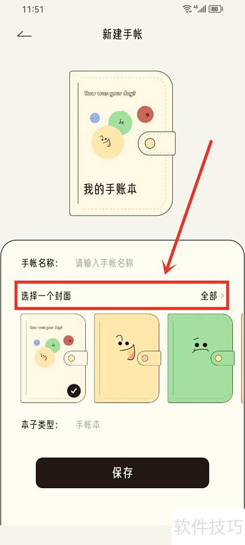 2、 进入新建手帐页面后,点击选择封面进行设置。