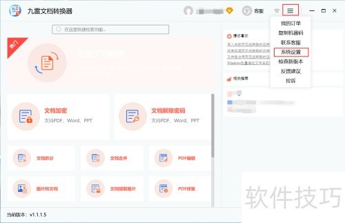 4、 点击右上角三图标,选择菜单中的系统设置,即可进入九雷文档转换器的全局配置...