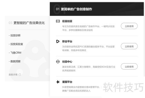 5、 巨量引擎提供涵盖创意中心、即合平台、星图平台及程序化创意在内的多样化创意工具,打造高效的内容生产闭环。广告主可借助图灵、即视等在线工具,一键生成高质量的图片与视频素材,大幅提升内容产出效率。易拍APP简化视频制作流程,降低创作门槛,让非专业用户也能轻松完成专业级视频制作。即合平台支持批量生成高品质视频内容,显著提升广告表现力与传播价值。星图平台则打通内容供需链路,提供安全、高效且便捷的内容交易解决方案。程序化创意技术通过智能组合与优化,助力广告主提升创意生产效率,增强内容吸引力,充分释放广告投放的潜在价值。