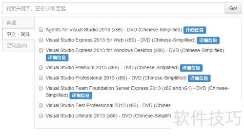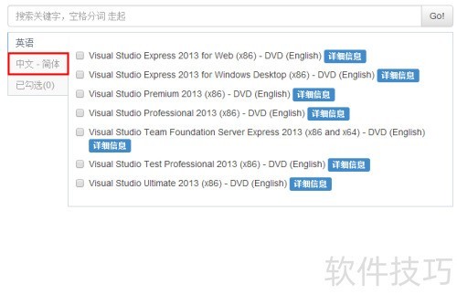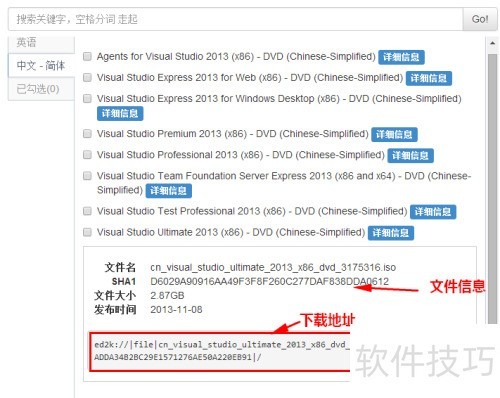5、 在中文简体下载列表中,进一步查找所需的具体版本,例如 VS2013 旗舰版,找到后点击其对应的详细信息按钮。