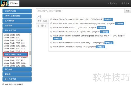 3、 在项目列表中找到并选择所需版本的 Visual Studio(如 VS2013),右侧将自动显示对应的下载选项,点击即可开始下载。