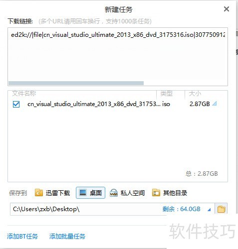 7、 打开下载软件如迅雷,粘贴已复制的链接,即可开始下载所需的Visual Studio版本。