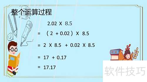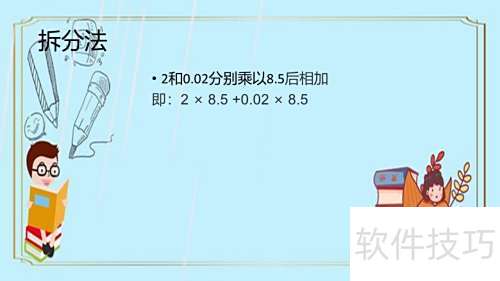 计算2.02×8.5时,可将2.02拆成2与0.02,分别相乘后再相加,使运算更简便。