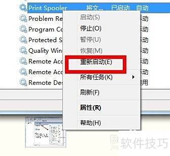 5、 找到print spooler服务,右键选择重新启动,若需重启服务请执行此操作。