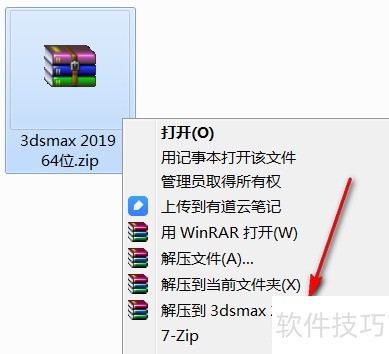 3、 右键点击软件压缩包,选择解压至3dsmax 2019 64位文件夹。