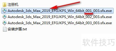 4、 解压后进入文件夹,找到名为Autodesk-3ds-Max-2019-EFGJKPS-Win-64bit-001-003.sfx的文件,三个相似文件中请确认选择编号为001的,双击即可开始运行安装程序。