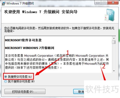 3、 完成软件下载后,双击安装包启动Windows 7升级顾问工具的安装程序,首先勾选我接受许可条款,随后点击安装按钮。安装过程中无法更改默认路径,系统将自动完成后续步骤。