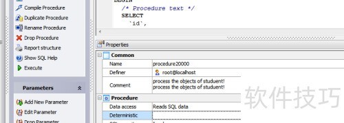 7、 选择存储过程的确定性选项,然后点击编译过程按钮进行编译操作。