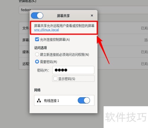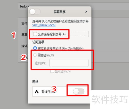 6、 勾选允许远程控制屏幕,设定共享密码,并开启网络连接开关。