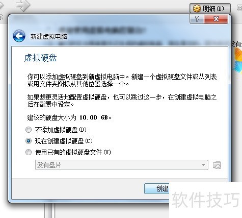 3、 选择现在创建虚拟硬盘选项,随后点击创建按钮完成操作。