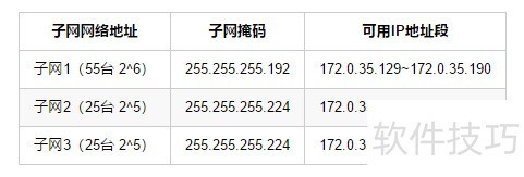 12、 子网2的起始地址在前一个子网结束地址的基础上加3,即190加3,得到172.0.35.193。该子网的大小为32(对应2的5次方),同样使用加32再减3的计算方式,得出其结束地址为172.0.35.222。因此,子网2的可用IP地址范围为172.0.35.193至172.0.35.222。
