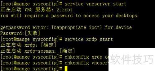 4、 重启VNC服务时执行service vncserver start,若出现错误提示可暂时忽略,服务通常仍能正常启动。