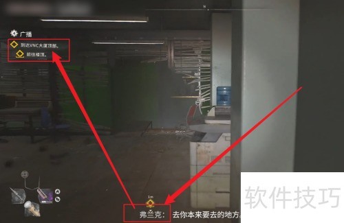 1、 进入游戏后,先与弗兰克对话,接取前往VNC大厦楼顶的任务。