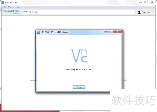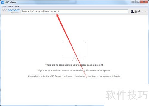 1、 启动VNC Viewer,在顶部地址栏中输入目标远程服务器的IP地址即可连接。
