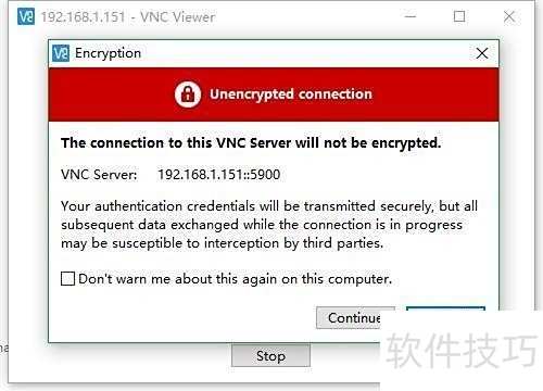 3、 软件显示VNC服务IP,连接未加密,请点击继续以继续操作。