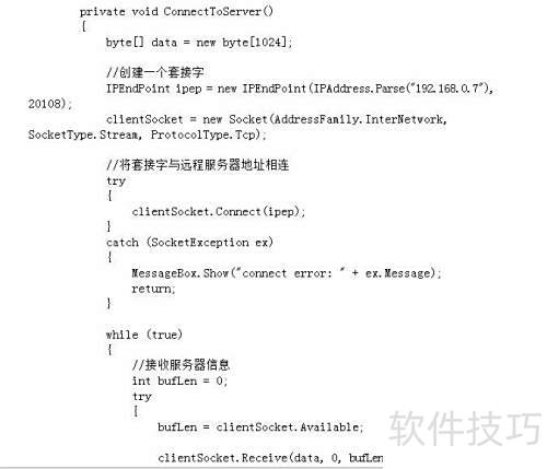 2、 创建套接字,连接目标,循环接收数据,持续通信,最后关闭连接。