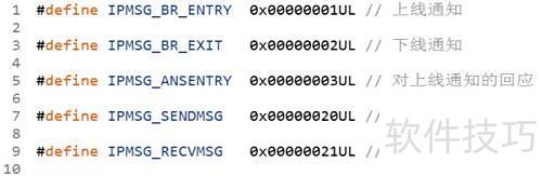 3、 网上可下载的IPMSG协议包含大量宏定义,我们无需逐一查看,只需选取其中几个进行分析,便可举一反三,理解整体原理。