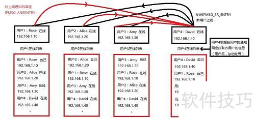 4、 系统包含五个宏定义,当新用户上线时,会发送IPMSG_BR_ENTRY广播通知。其他用户接收到该通知后,自动回复IPMSG_ANSENTRY作为响应。发送广播的用户通过收集这些回复,获取各个用户的在线状态,同时各接收方也会据此更新用户列表信息,实现用户状态的实时同步与维护。