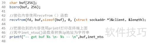 14、 接收信息使用的是recvfrom()函数,从图中可以看出,其功能类似于文件IO中的read()函数,通过文件描述符fd将数据读取到缓冲区buf中,随后利用printf函数将内容输出显示在终端界面上。