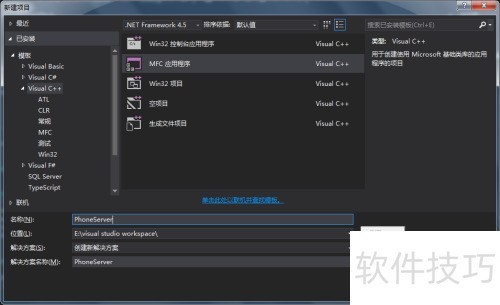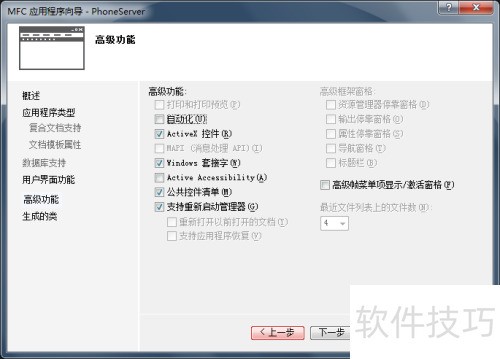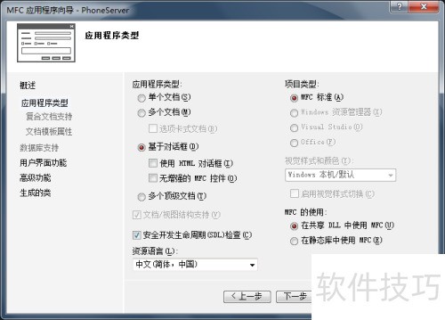 2、 在项目配置向导中,选择基于对话框模式,并启用Windows套接字选项。