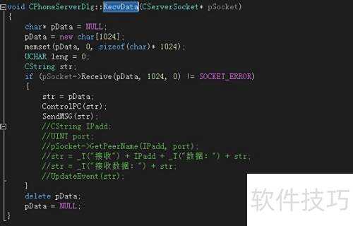 80、 该函数在CServerSocket类的OnReceive消息响应中被调用,负责对接收到的数据进行解析与处理,实现对计算机的远程控制。同时,将收到的数据转发给所有连接的客户端,实现类似群发消息的功能。通过CSocket类提供的GetPeerName方法,可获取当前连接用户的IP地址与端口号,用于标识和管理客户端连接。