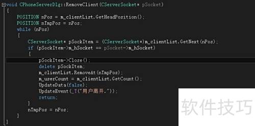 72、 该函数在CServerSocket类的OnClose事件中被触发,通过POSITION结构遍历用户链表,定位已下线的用户,将其资源释放,从链表中移除,并同步更新系统日志信息,确保连接状态的实时维护与记录完整。