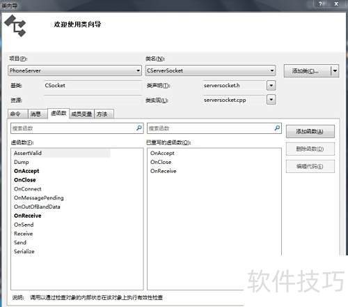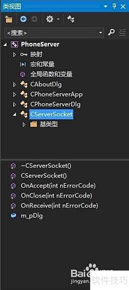 6、 在类视图中新建一个继承自CSocket的类CServerSocket,并通过类向导为其添加三个成员函数,用于实现特定功能。