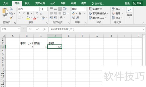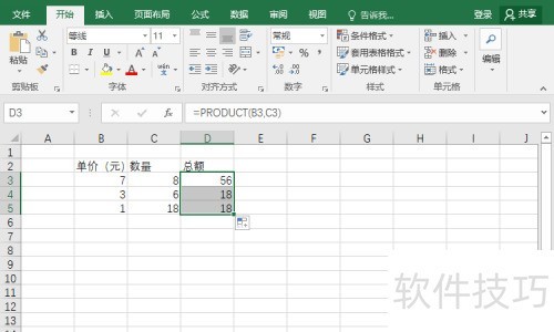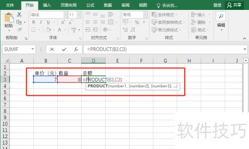1、 在已知商品单价和数量的情况下,计算总价时,可在目标单元格中输入=PRODUCT(B3,C3),该公式将计算B3与C3单元格数值的乘积,从而得出商品的总金额。