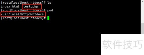 15、 进入 Apache 的 Web 目录 /usr/local/httpd/htdocs,创建名为 test.php 的文件。