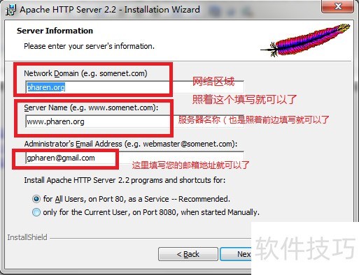 5、 安装Apache时,只需双击运行安装程序,过程与其他Windows软件类似。在填写服务器信息时,只要输入内容符合基本格式要求即可,无特殊限制,操作简单直观,适合初学者快速完成安装配置。