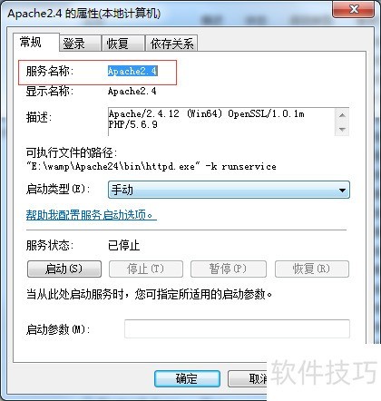 4、 右键点击Apache服务,选择属性,查看并记录服务名称信息。