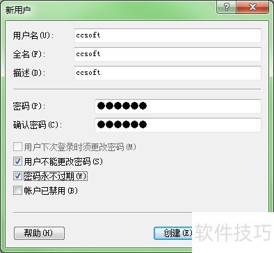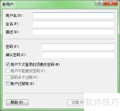 7、 接下来进行用户创建操作。保持在当前界面,于左侧目录树中依次展开配置→本地用户和组→用户,右键点击用户选项,选择新用户。在弹出的窗口中,用户名、全名和描述三项建议填写相同内容,密码由用户自行设定。下方的选项需注意:取消勾选用户下次登录时须更改密码,根据实际需求勾选用户不能更改密码和密码永不过期,以确保账户长期稳定使用。设置完成后点击确定即可完成用户创建。